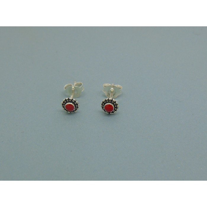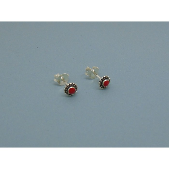 A pair of circular sterling silver studs with a red stone and an ornate surround. The red central stone is bordered by two beaded rows, the red stone and the beaded design helps to accentuate the design. The studs come with the sterling silver butterfly backs to keep them securely held in place.