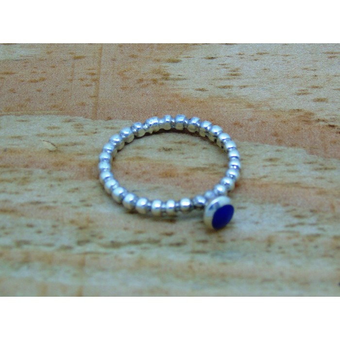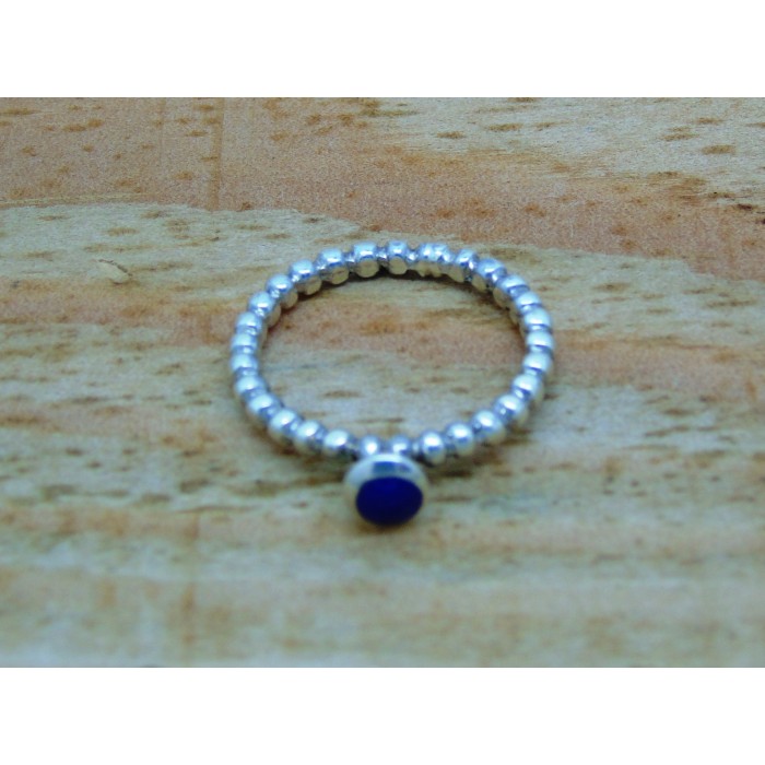 A beaded sterling silver stacking ring with a blue stone. The stone sits perfectly upon the decorative setting.
