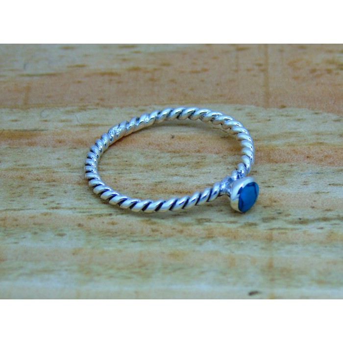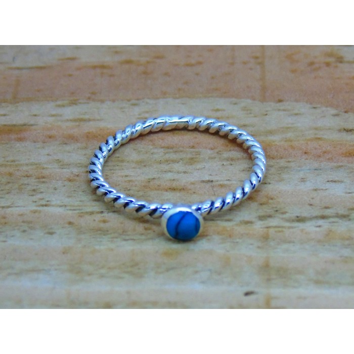A twisted sterling silver stacking ring with a turquoise stone. The stone sits perfectly upon the decorative ring.