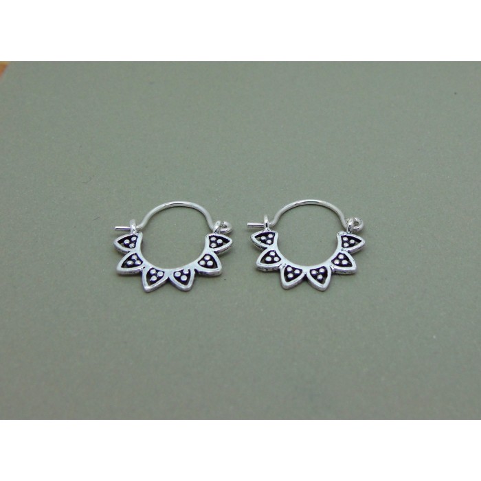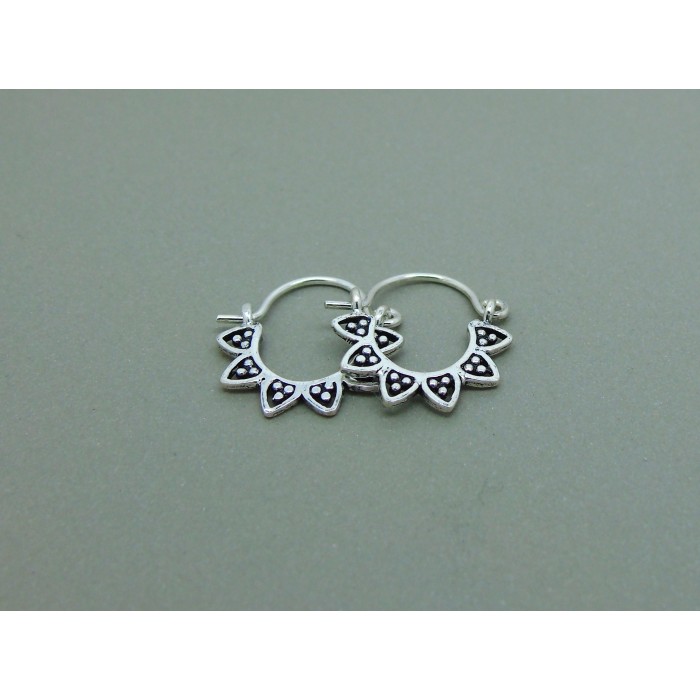 A decorative pair of sterling silver creole earrings with a flower petal design.