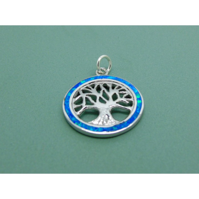 A beautiful sterling silver round tree of life pendant with a lab grown opal surround. The opal surround helps to accentuate the central tree of life design.